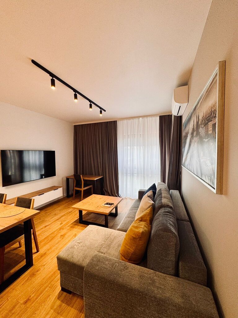 - Salon: Duża rozkładana sofa z funkcją spania, telewizor 65 cali, komplet zapasowej pościeli.