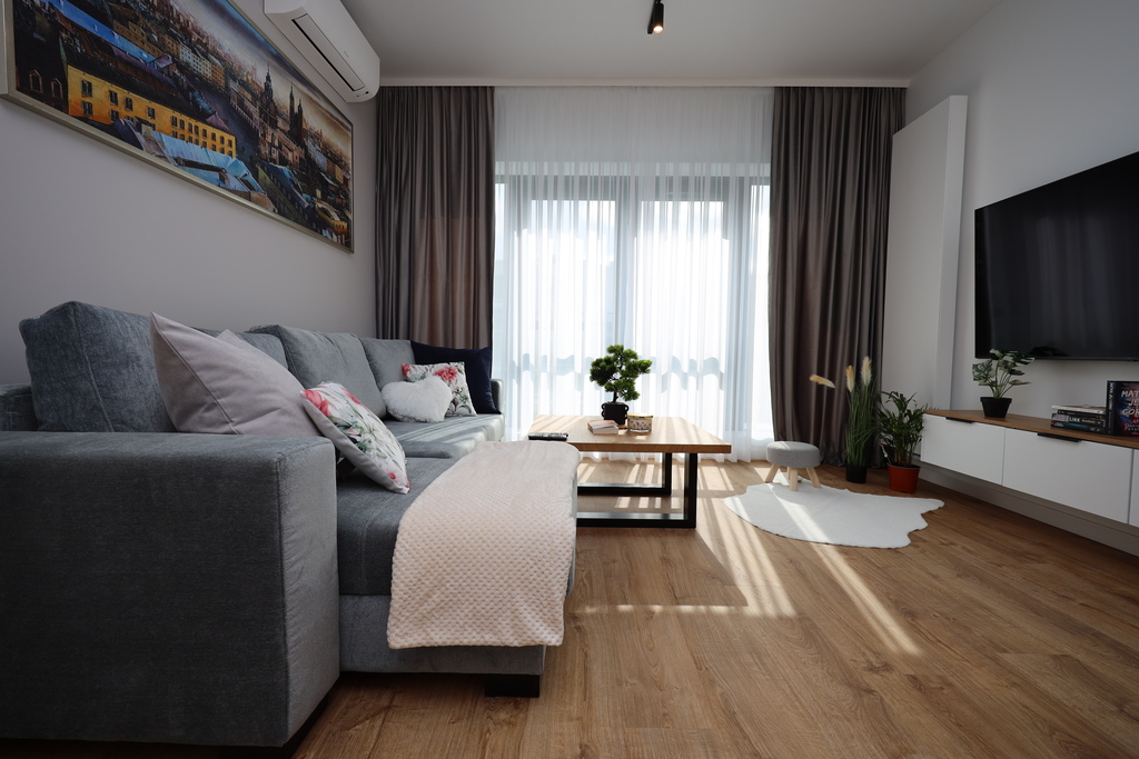-salon: duża rozkładana sofa z funkcją spania, telewizor 65 cali, komplet zapasowej pościeli,