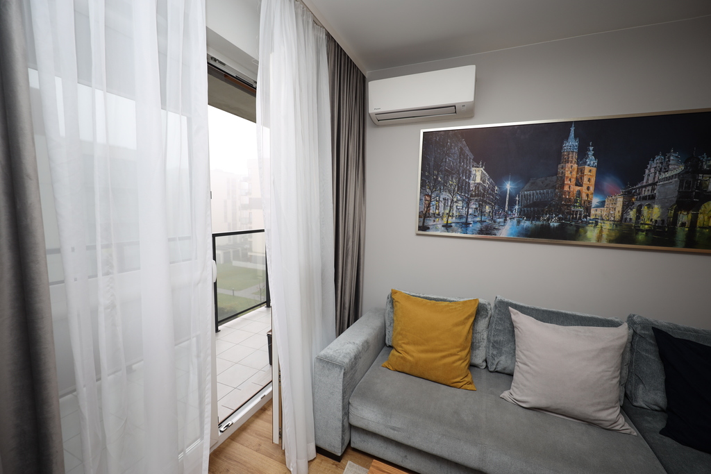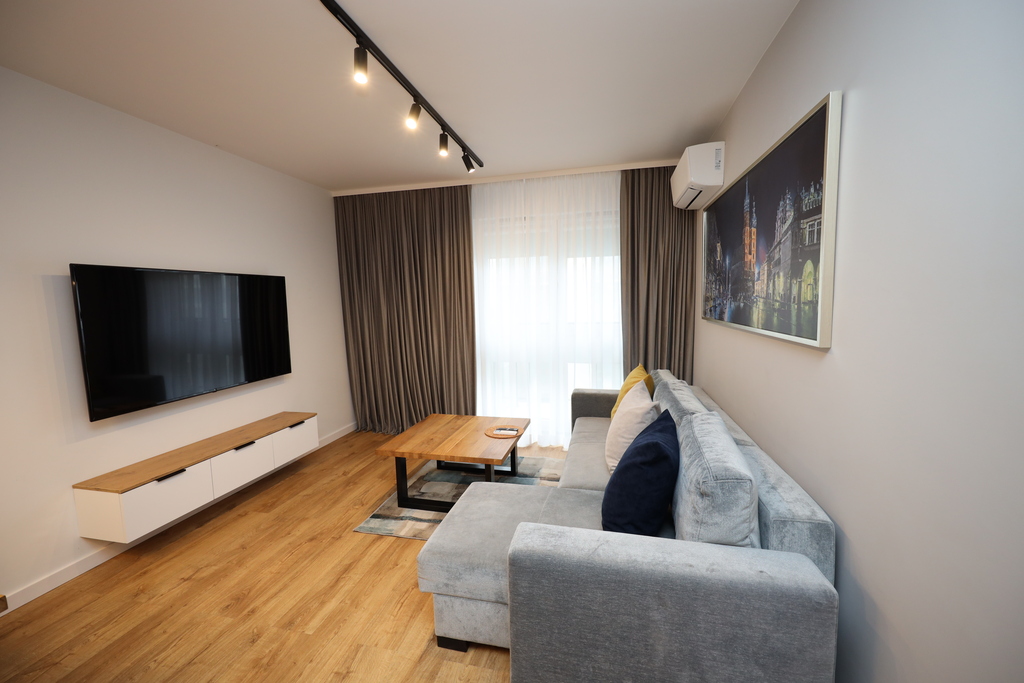 -salon: duża rozkładana sofa z funkcją spania, telewizor 55 cali, klimatyzacja Daik