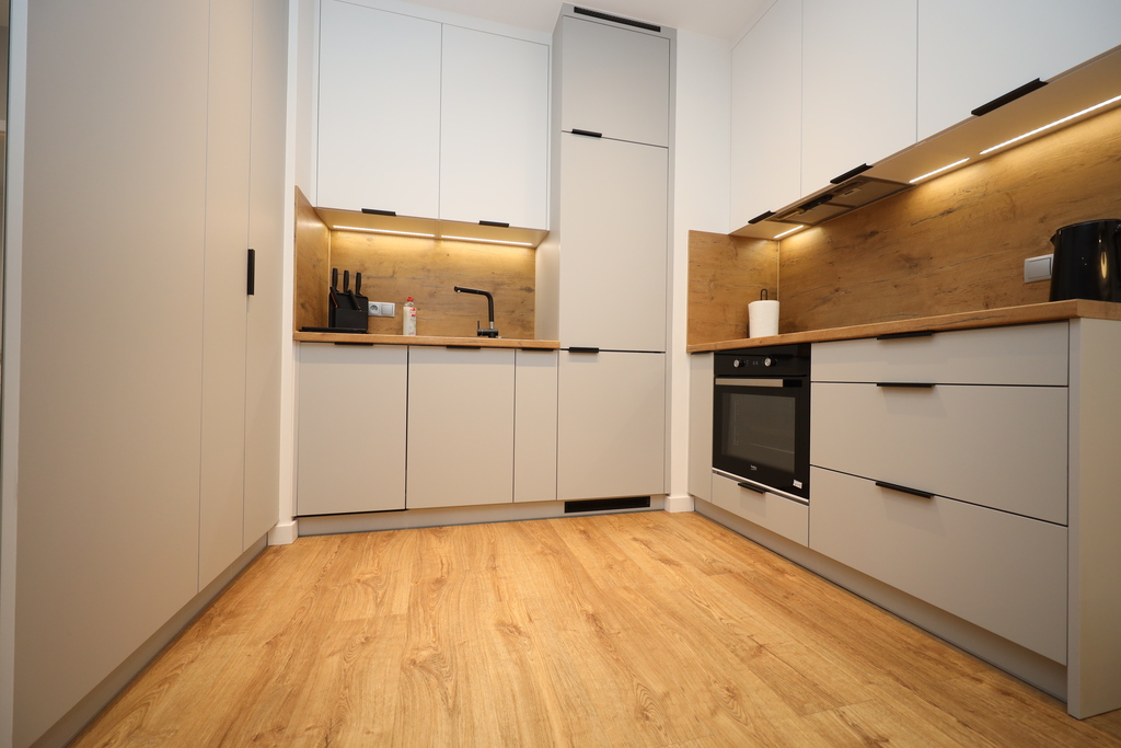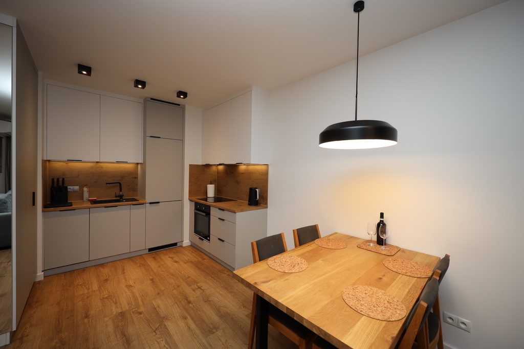 Mieszkanie zostało wykończone w wysokim standardzie, meble zrobione na wymiar.