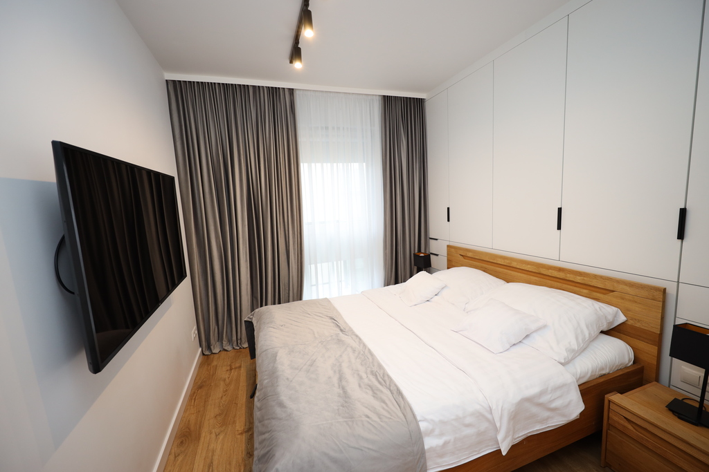 -sypialnia: duże łóżko, telewizor 55 cali, szafy,