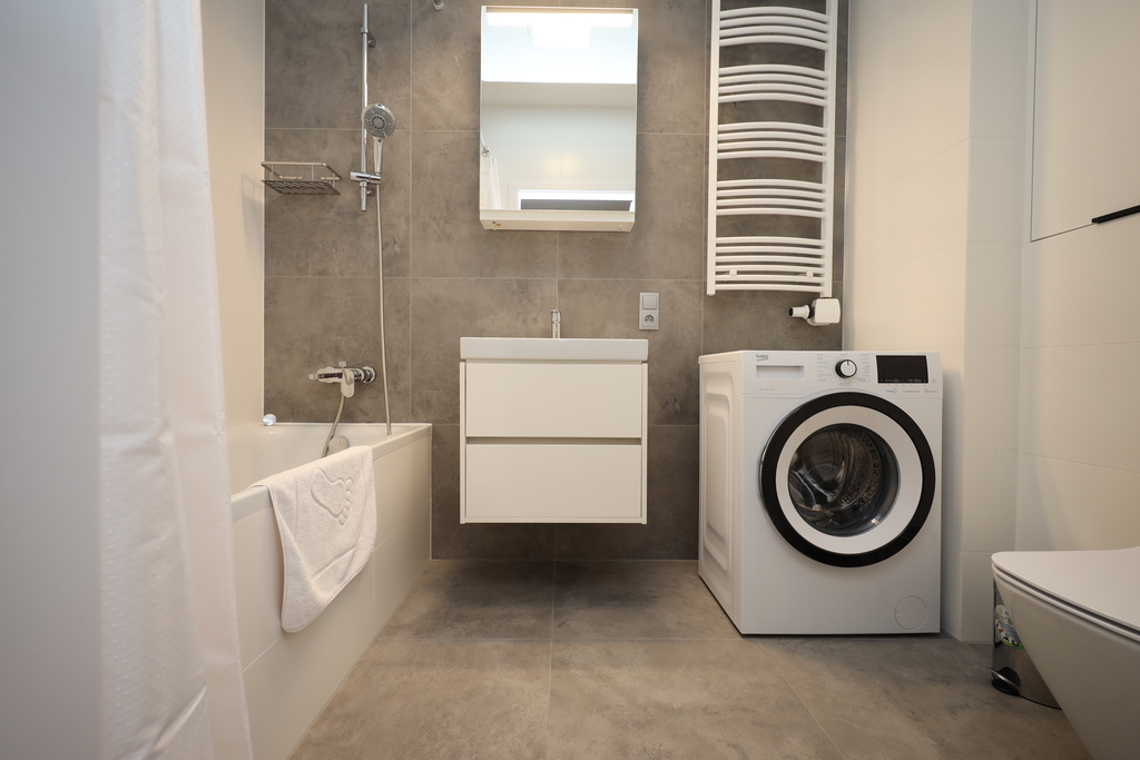 -łazienka: wanna, WC, duża szafka wnękowa, suszarka do włosów,