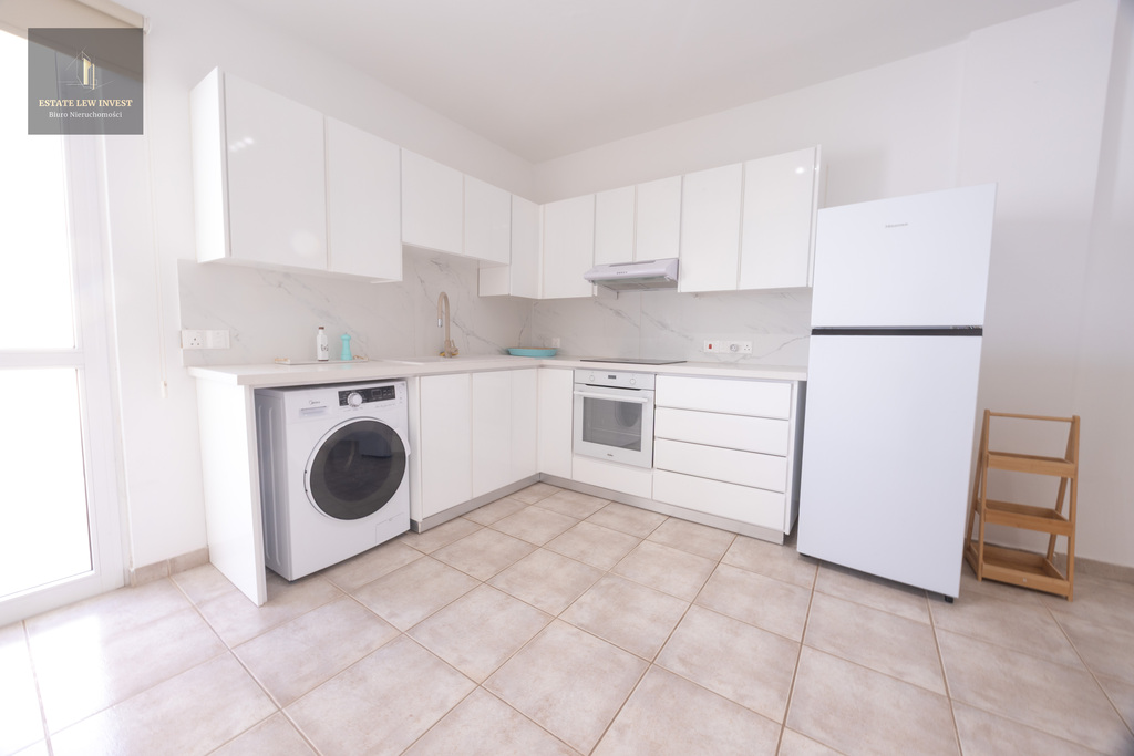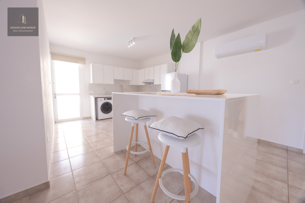 Otwarta przestrzeń dzienna obejmuje dużą, nowoczesną kuchnię z wyspą oraz nowym sprzętem AGD, a także bezpośrednim wyjściem na jeden z dwóch balkonów(16m2). Salon jest jasny i przestronny, z wyjściem na zadaszoną werandę z delikatnym morskim widokiem – idealne miejsce na kolacje na świeżym powietrzu!